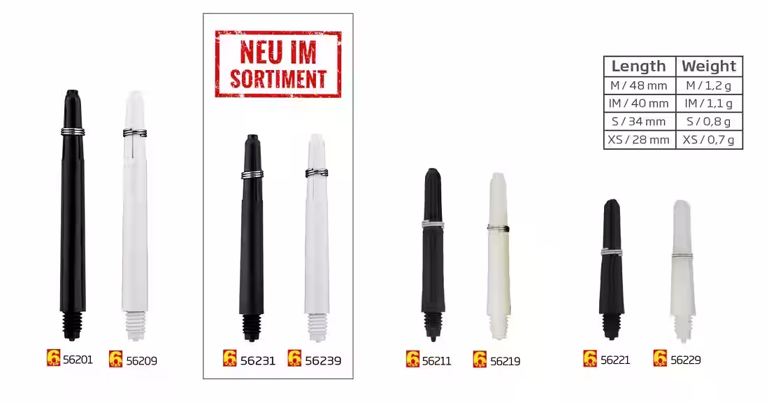 Neue Verpackung Sixpack – 6 Satz Sh?fte im Clampack. Nylon Shaft, der Klassiker unter den Shafts, mit Federring f?r bestm?glichen Halt der Flights, in der Original Qualit?t, leicht und bruchfest, Nylon Klassik ist in drei L?ngen und mit 2BA Gewinde verf?gbar.