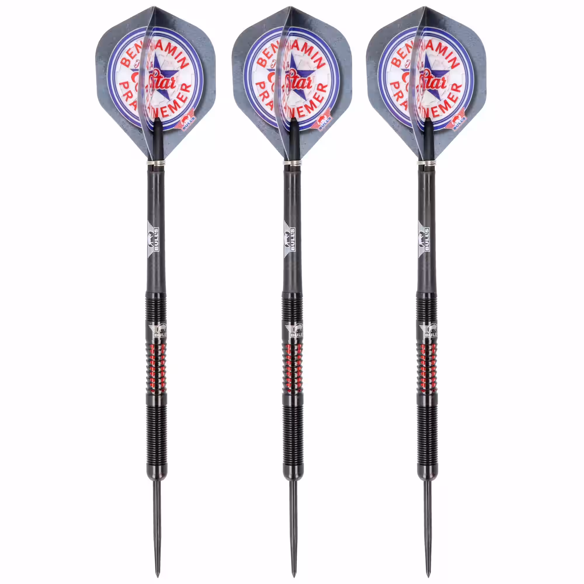 Bulls Benjamin Pratnemer Steeldart, 90% Tungsten, 20 Gramm kurz und kompakt, die Benjamin Pratnemer Darts stellen sich vor ✅ Benjamin Pratnemer “The Star” Steeldarts von Bull’s! ✅ Gewicht 20 Gramm ✅ 90% Tungsten ✅ gerade Barrelform mit verschiedenen Griparten und Gripzonen am Barrel verteilt! ✅ aggressiver Grip (Shark-Grip) in der Mitte des Barrels ✅ hochwertige Verarbeitung und Verpackung, gewohnt hohe Qualität von Bull’s! Du bist auf der Suche nach einem Steeldart, der nicht nur durch seine Optik beeindruckt, sondern auch in Sachen Performance ganz oben mitspielt? Dann ist der Bull’s Benjamin Pratnemer Steeldart genau das Richtige für dich. Dieses exklusive Dart-Set wurde speziell nach den Vorlieben des slowenischen Dartprofis Benjamin Pratnemer, auch bekannt unter seinem Spitznamen “The Star”, entwickelt – und das merkt man in jedem Detail. Ob du ambitionierter Hobbyspieler bist oder den nächsten Schritt Richtung Profi gehen willst: Mit diesem Dart hast du das perfekte Werkzeug in der Hand. Höchste Qualität für höchste Ansprüche Der Steeldart besteht aus einem 90% Tungsten Barrel, was ihn besonders schlank, langlebig und perfekt ausbalanciert macht. Tungsten – zu Deutsch: Wolfram – ist das Material der Wahl im professionellen Dartsport. Warum? Ganz einfach: Es ermöglicht ein schmales Design bei gleichzeitig hohem Gewicht. Dadurch kannst du deine Darts enger gruppieren und präziser werfen. Mit einem Gewicht von 20 Gramm liegt der Dart optimal in der Hand – nicht zu schwer, nicht zu leicht – perfekt für ein kontrolliertes Spiel. Bulls Benjamin Pratnemer “The Star” Steeldart – Präzision, Kontrolle und Stil in Perfektion Was den Benjamin Pratnemer Steeldart wirklich besonders macht, ist seine gerade Barrelform in Kombination mit verschiedenen Gripzonen. Du bekommst hier einen Barrel, der dir in jeder Spielsituation den nötigen Halt und das richtige Gefühl gibt. Vorne findest du einen klassischen Ringgrip, der dir ein stabiles Fingergefühl beim ersten Kontakt verleiht. In der Mitte setzt der Barrel auf eine glatte Fläche, ideal für Spieler, die dort umgreifen oder den Dart leicht durch die Finger gleiten lassen möchten. Im hinteren Bereich wird es dann richtig spannend: Hier sitzt der aggressive Shark-Grip mit vertikalen Einschnitten – perfekt, wenn du deinen Dart mit mehr Spin oder Power spielst. Dieser Bereich sorgt für festen Halt und präzise Kontrolle, auch bei schnellen Würfen. Egal, welcher Griffstil zu dir passt – dieser Dart geht auf deine Bedürfnisse ein und fühlt sich an, als wäre er direkt für dich gemacht. Edles Design trifft auf persönliche Note Auch optisch macht der Bull’s Benjamin Pratnemer Steeldart richtig was her. Der Barrel ist in einem edlen Schwarz-Rot-Farbschema gehalten, das für einen modernen, kraftvollen Look sorgt. Die rot-schwarze Optik ist nicht nur ein echter Hingucker, sondern spiegelt auch die Leidenschaft und Energie wider, mit der Benjamin Pratnemer selbst ans Oche tritt. Abgerundet wird das Design durch die hochwertigen Komponenten des Sets: Du bekommst die Bulls Dartspitze in Schwarz und 35mm Länge, einen Bull’s Nylon Shaft in Medium-Länge, und natürlich den speziell für diesen Dart entworfenen Benjamin Pratnemer Flight – “Player 100 Benjamin Pratnemer 90 No2”. Dieser Flight ist nicht nur individuell gestaltet, sondern besteht aus robustem 100-Micron-Material und sorgt für einen stabilen Flug. Der Flight ist übrigens auch separat erhältlich – falls du mal Ersatz brauchst oder deine Sammlung erweitern möchtest. Maßgeschneidert für einen Champion Dass dieser Dart Teil der Bull’s SATELLITE-Serie ist, sagt schon einiges über seine Qualität aus. Die SATELLITE-Serie steht für Innovation, hohe Verarbeitungsstandards und eine enge Zusammenarbeit mit Profis – in diesem Fall mit Benjamin Pratnemer selbst. Als einer der bekanntesten Dartspieler Sloweniens bringt er seine Erfahrung und sein Spielverständnis direkt in die Entwicklung dieses Sets ein. Du bekommst also nicht irgendeinen Steeldart – du bekommst einen Dart, der auf höchstem Niveau getestet und optimiert wurde. Ein Dart, mit dem ein echter Profi auf die Bühne geht – und mit dem auch du dein Spiel auf ein neues Level heben kannst. Dein perfekter Begleiter am Oche Ob Training oder Turnier – mit dem Bull’s Benjamin Pratnemer Steeldart hast du einen verlässlichen Partner an deiner Seite. Er kombiniert präzise Verarbeitung, ergonomisches Design und das Wissen eines echten Profis zu einem Produkt, das mehr ist als nur ein Dart: Es ist ein Statement. Zusammengefasst Gewicht: 20 g Material: 90% Tungsten Barrelform: Gerade Gripzonen: Ringgrip (vorn), glatte Fläche (Mitte), Shark-Grip mit vertikalen Einschnitten (hinten) Spitzen: Steeldartspitze Schwarz, Länge 35mm Shafts: Bull’s Nylon Medium (Schwarz) Flights: Player 100 Benjamin Pratnemer No2 (100 Micron) Serie: Bull’s SATELLITE Design: Schwarz-Rot mit persönlichem Branding Spieler: Benjamin Pratnemer – „The Star“ aus Slowenien Wenn du einen Dart willst, der deinen Stil unterstützt, dein Spielgefühl verbessert und einfach Spaß macht – dann ist der Bull’s Benjamin Pratnemer “The Star” Steeldart genau dein Ding. Probier ihn aus und spür selbst, warum dieser Dart seinem Namen alle Ehre macht. Technische Daten Art: Steeltip Material: 90% Tungsten Gewicht: 20 Gramm Grip: Ringgrip, Sharkgrip Barrelform: Gerade Farbe: Schwarz, rot