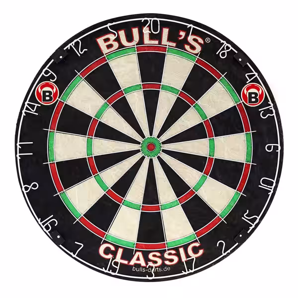 BULL`S Classic Bristle-Board Sisal Dartboard in der offiziellen Turnierabmessung ca. 45 x 4 cm, mit aufgesetztem Spider. Eine Nutzungsanleitung und eine Boardwandhalterung werden mitgeliefert. Sichbtare Risse: Dartboards aus Sisal sind ein aus Naturprodukten hergestelltes Board (Sisal sind Fasern aus Bl?ttern einiger Agaven und werden unter hohem Druck in die bekannte, runde Form gepresst). Daher sind sichtbare Risse im Sisal sind keine Produktionsfehler oder Mangel (Naturprodukt). Zur Erkl?rung f?r alle Neueinsteiger: Die Sisalfasern werden i.d.R. zu Str?ngen gedrillt und anschlie?end in kleine Scheiben geschnitten. Diese Str?nge werden geb?ndelt verpresst. Die ?berg?nge der Sisalstr?nge k?nnen (von Board zu Board unterschiedlich) sichtbar sein, so dass sich die markanten Risse bilden k?nnen.
