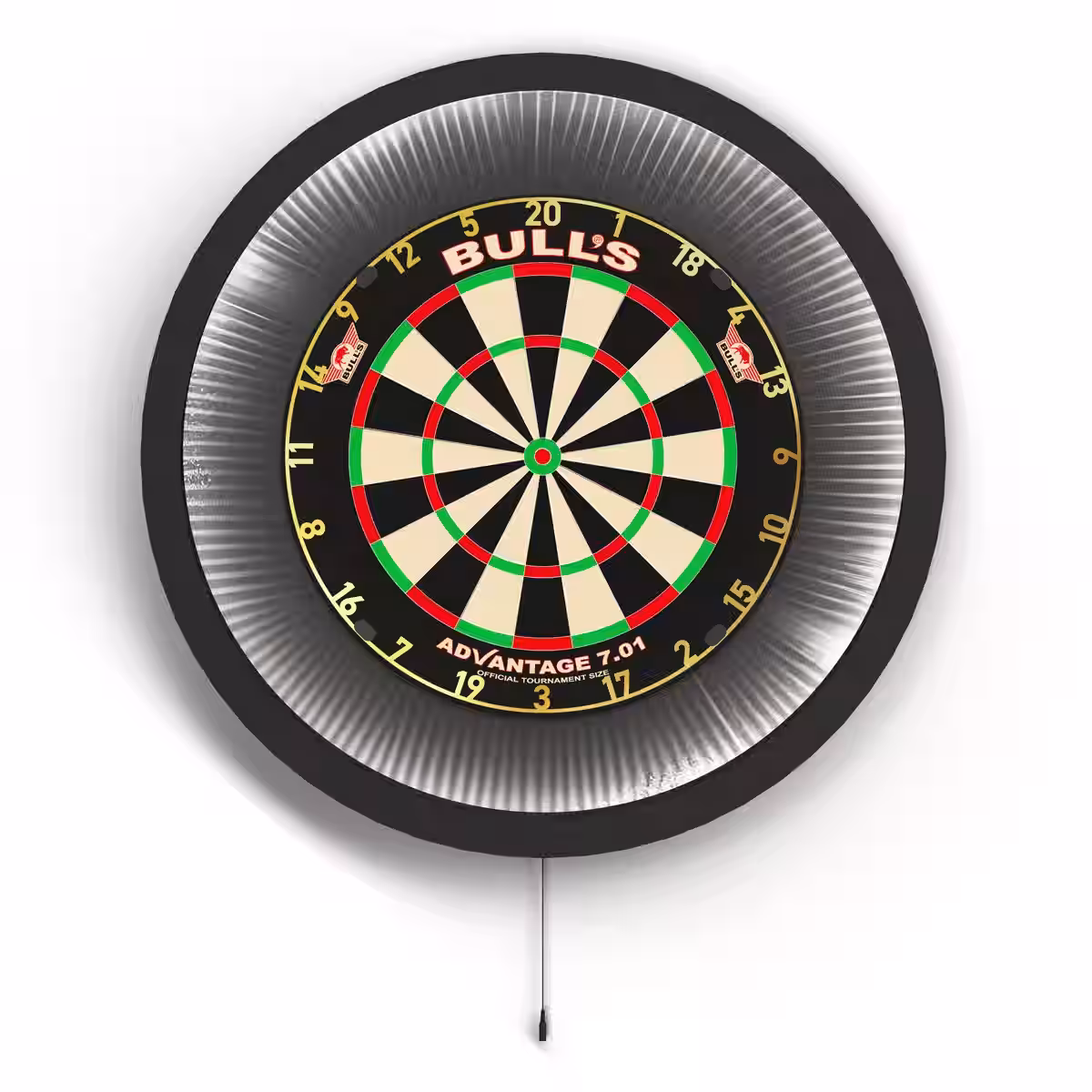 Bull’s Lumo XL Lightning Surround, XL-Version, LED Beleuchtung und Surround in einem kurz und kompakt, das Lumo XL Lightning Surround stellt sich vor ✅ LED Dartboardlicht, Dartboard Beleuchtung mit 120 weißen LED ✅ neu und verbessert: mehrere LEDs und 11cm mehr Abdeckung als der Vorgänger! ✅ 360°-LED-Beleuchtung ohne Schatten ✅ Doppelfunktionsdesign: hochwertiges Beleuchtungssystem + praktischer Wandschutz ✅ passt auf alle Standard-Dartscheiben ✅ kein Werkzeug oder feste Vorrichtungen notwendig, einfach über die Dartscheibe schieben! ✅ hochwertige Verarbeitung, gewohnt hohe Qualität von Bulls! Stell dir vor, du stehst vor deinem Dartboard, bereit für den nächsten Wurf. Das Licht ist perfekt – keine störenden Schatten, keine blendenden Spots, sondern eine gleichmäßige, helle Ausleuchtung, die dein Spiel auf ein neues Level hebt. Genau das bietet dir die Bull’s Lumo XL Lighting Surround – die Revolution in der Dartbeleuchtung. Entwickelt als direkter Nachfolger der beliebten Lumo 2, bringt die XL-Version alles mit, was du dir wünschst: Mehr Schutz, mehr Licht, mehr Qualität. Noch größer, noch heller – die Evolution der Dartbeleuchtung Mit einem imposanten Durchmesser von 70 cm setzt die Bull’s Lumo XL neue Maßstäbe. Im Vergleich zur Lumo 2 bekommst du ganze 11 cm mehr Wandschutz – das bedeutet weniger Sorgen über Streudarts und mehr Fokus auf dein Spiel. Der zusätzliche Radius schützt deine Wand umfassender und verleiht deinem Setup gleichzeitig ein professionelles Aussehen. Die Kombination aus High-End-Beleuchtung und sicherem Dartfangrahmen macht die Lumo XL zur ersten Wahl für ambitionierte Hobbyspieler und Profis gleichermaßen. 360° LED-Ring – kein Schatten, nur Klarheit Du kennst das: Schatten auf dem Dartboard können das Zielen erschweren, vor allem bei Turnieren oder Trainingssessions, bei denen es auf jeden Punkt ankommt. Die Bull’s Lumo XL eliminiert dieses Problem mit ihrem 360°-LED-Ring, der dein Board aus jedem Winkel perfekt beleuchtet. Mit 120 LEDs und einer beeindruckenden Helligkeit von 22–24 Lumen pro LED sorgt die Surround für eine Lichtleistung von 1440 Lumen – das ist mehr als genug, um auch in dunkleren Räumen oder Kellern optimale Sichtverhältnisse zu schaffen. Bulls Lumo XL Lightning Surround – Deine ultimative Dartboard-Beleuchtung und Wandschutz in einem Was die Lumo XL wirklich einzigartig macht, ist ihr Doppelfunktionsdesign. Du brauchst keine separate Beleuchtung oder extra Wandschutz – dieses Produkt kombiniert beides in einem eleganten, durchdachten System. Die Konstruktion ist stabil, langlebig und gleichzeitig leicht, sodass du es problemlos überall einsetzen kannst. Dank der universellen Kompatibilität passt die Lumo XL auf alle Standard-Dartscheiben – ganz ohne Werkzeug oder komplizierte Halterungen. Einfach aufsetzen, anschließen und loslegen. Unterwegs spielen? Kein Problem! Wenn du öfter mal unterwegs bist – sei es auf Turnieren, beim Kumpel oder auf Reisen – wirst du den mitgelieferten Reiseadapter lieben. Er macht die Bull’s Lumo XL weltweit kompatibel, sodass du dir nie wieder Gedanken über die richtige Stromversorgung machen musst. Einfach einstecken und überall die gleiche Top-Beleuchtung genießen. Langlebig, sicher und zertifiziert Bull’s hat bei der Lumo XL auf höchste Qualität geachtet. Die LED-Komponenten sind nicht nur extrem effizient, sondern auch auf Dauerbetrieb ausgelegt. Die gesamte Produktion ist CE- und ROHS-zertifiziert, was bedeutet, dass du ein Produkt bekommst, das sowohl sicher als auch umweltfreundlich ist. Mit einer Spannung von 12 V und einem 12 V DC-Stecker ist der Betrieb nicht nur stabil, sondern auch energieeffizient – ideal für den regelmäßigen Einsatz zuhause oder im Vereinsheim. Warum die Bull’s Lumo XL dein Setup revolutioniert Mit der Bull’s Lumo XL bekommst du mehr als nur eine Beleuchtung. Du bekommst ein durchdachtes, funktionales System, das dein Dartspiel verbessert, deinen Raum schützt und dabei noch richtig gut aussieht. Die einfache Handhabung, die starke Performance und die hochwertige Verarbeitung machen sie zu einem echten Must-have für alle, die Dart ernst nehmen. Ob du gerade erst anfängst oder schon seit Jahren spielst – die Lumo XL gibt dir genau das, was du brauchst, um dein Spiel aufs nächste Level zu heben. Und das alles ohne teure Zusatzteile oder komplizierte Montagen. Einfach, clever, effizient – so wie es sein sollte. Fazit: Mehr als nur Licht – dein Dartspiel verdient das Beste Wenn du auf der Suche nach der perfekten Kombination aus Licht, Schutz und Design bist, ist die Bull’s Lumo XL Lighting Surround genau das Richtige für dich. Sie liefert dir die Helligkeit, die du brauchst, den Schutz, den deine Wand verdient, und das alles in einem stylischen, robusten Produkt. Gönn dir und deinem Spiel das Upgrade, das du verdienst – mit der Lumo XL von Bull’s. Technische Daten Außendurchmesser: 70cm Tiefe: 11cm Anzahl LEDs: 120 Helligkeit pro LED: 22-24 Lumen Helligkeit: 1440 Lumen Anschluss: 12V DC-Stecker Zertifizierungen: CE, ROHS