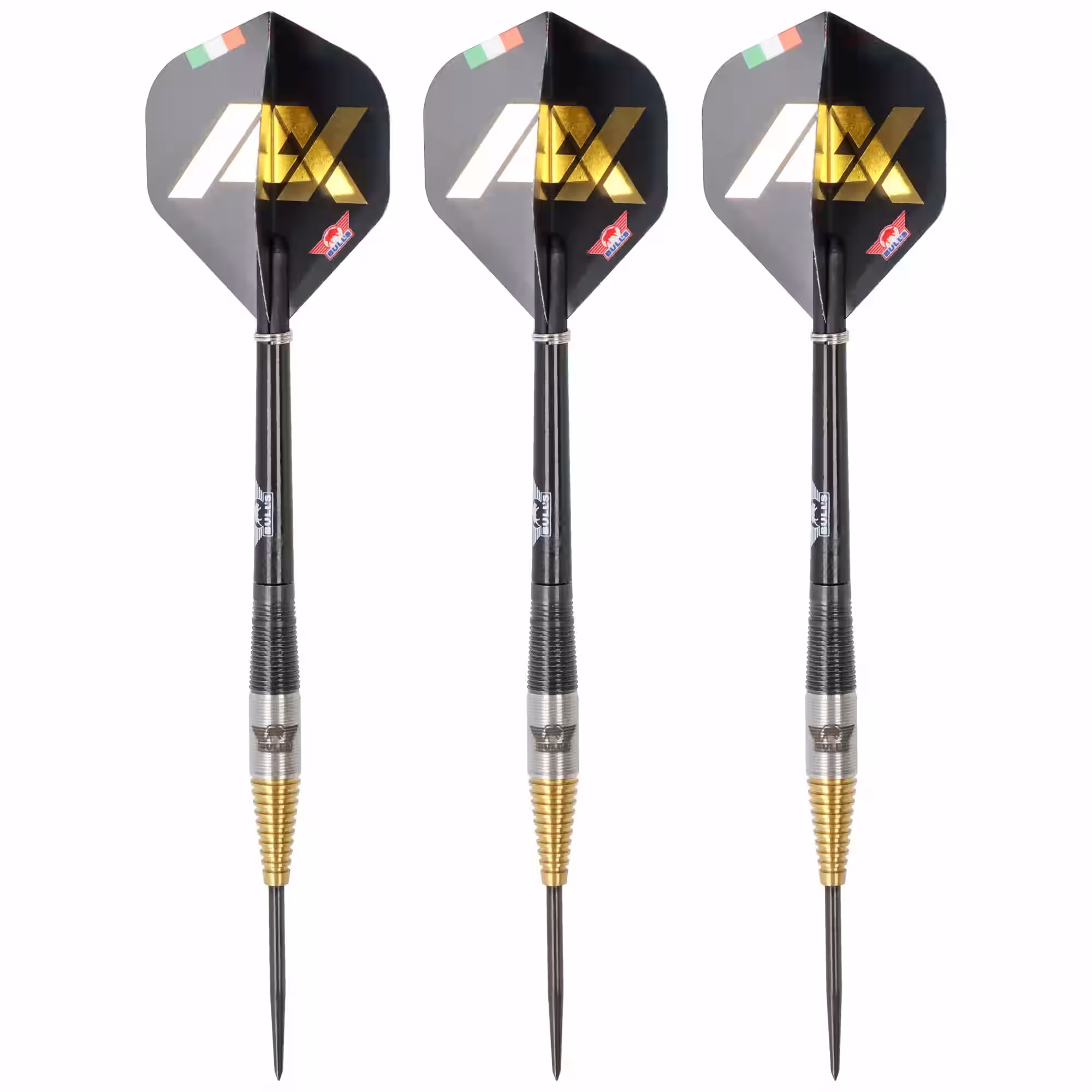 Bulls Massimo Dalla-Rosa Steeldart, 90% Tungsten, 20 Gramm kurz und kompakt, die Massimo Dalla-Rosa Steeldarts stellen sich vor ✅ Massimo Dalla-Rosa Steeldarts von Bulls! ✅ Gewicht 20 Gramm ✅ 90% Tungsten ✅ Barrel Länge 43mm, Durchmesser 7,34mm ✅ torpedoförmige Barrelform ✅ hochwertige Verarbeitung, gewohnt hohe Qualität von Bulls! Wenn Du auf der Suche nach einem Dart bist, der nicht nur mit Qualität, sondern auch mit Charakter überzeugt, dann bist Du beim Bull’s Massimo Dalla-Rosa Steeldart genau richtig. Dieser Dart ist mehr als nur ein Sportgerät – er ist Ausdruck von Stil, Technik und Mut zur Individualität. Inspiriert vom italienischen Dartspieler Massimo „Max“ Dalla Rosa, bietet Dir dieser Dart ein einzigartiges Spielerlebnis mit torpedoförmigem Barrel, kompaktem Handling und beeindruckender Performance. Ein Dart für Spieler mit Anspruch Mit einem Gewicht von 20 Gramm liegt der Dart angenehm leicht in der Hand, ohne dabei an Durchschlagskraft einzubüßen. Der Barrel besteht aus hochwertigem 90% Tungsten – einem Material, das sich durch extreme Dichte und Langlebigkeit auszeichnet. Dadurch ist es möglich, den Dart schlank und kompakt zu gestalten, ohne Kompromisse bei der Stabilität einzugehen. Mit einer Länge von 43 mm und einem Durchmesser von 7,34 mm ist der Barrel ideal für Dich, wenn Du einen präzisen, schnellen Abwurf bevorzugst. Die torpedoförmige Form sorgt für eine hervorragende Balance und unterstützt eine stabile Flugbahn – besonders bei kompakten Würfen mit viel Kontrolle. Bull’s Massimo “Max” Dalla-Rosa Steeldart, 90% Tungsten, 20 Gramm Das Design des Bull’s Massimo Dalla-Rosa ist nicht nur funktional, sondern auch optisch ein echtes Highlight. Die dreifarbige Gestaltung in Schwarz, Silber und Gold verleiht dem Dart ein edles, sportliches Aussehen. Der Barrel gehört zur exklusiven SATELLITE-Serie von Bull’s – ein klares Qualitätsmerkmal für Darts, die mit Präzision und Leidenschaft entwickelt wurden. Mehrere Gripzonen mit einem durchdachten Ringgrip ziehen sich entlang des Barrels. So findest Du beim Greifen stets Halt, egal ob Du den Dart eher vorne, mittig oder hinten hältst. Der Grip ist angenehm aggressiv – genug, um Dir maximale Kontrolle beim Wurf zu geben, ohne unangenehm zu wirken. Gerade bei schnellen, wiederholten Würfen spürst Du, wie gut dieser Dart in der Hand liegt. Für Spieler, die das Besondere suchen Der Massimo Dalla-Rosa Dart richtet sich an Spieler, die ihren Wurf bereits kennen und ein Tool suchen, das ihre Technik optimal unterstützt. Du brauchst keinen Dart „von der Stange“, sondern suchst ein Setup, das Deine individuelle Spielweise unterstreicht? Dann wird Dir dieser Dart gefallen. Ob im Training oder auf Turnieren – dieser Dart gibt Dir das Selbstvertrauen, das Du brauchst, um Dein Spiel aufs nächste Level zu heben. Die Kombination aus kurzer Barrel-Länge, torpedoförmigem Körper und strategisch platzierten Gripzonen sorgt für ein extrem schnelles Abwurfgefühl. Wenn Du gerne mit Tempo spielst und Wert auf präzise Platzierung legst, dann ist dieser Dart genau Dein Ding. Von der E-Dart-Spitze zum World Cup Auch wenn Massimo Dalla-Rosa in der internationalen Dartszene noch nicht jedem ein Begriff ist, gehört er in Italien längst zu den Topspielern – vor allem im E-Dart-Bereich. Dort konnte er bereits mehrere Turniersiege feiern und sich eine beeindruckende Reputation aufbauen. 2024 gelang ihm dann sein bisher größter Erfolg: die Qualifikation für den prestigeträchtigen PDC World Cup of Darts. Mit dieser Leistung hat Dalla-Rosa eindrucksvoll bewiesen, dass er auch im Steel-Dart-Bereich ganz vorne mitspielen kann. Mit dem nach ihm benannten Dart hältst Du also nicht nur ein Stück Sportgeschichte in der Hand – Du trägst auch den Spirit eines Spielers, der für Kampfgeist, Technik und italienisches Feuer steht. Hochwertige Verarbeitung Bull’s steht seit Jahren für höchste Qualität im Dartsport – und auch der Massimo Dalla-Rosa Dart macht hier keine Ausnahme. Jeder Dart wird mit höchster Präzision gefertigt und durchläuft strenge Qualitätskontrollen. Vom Material über das Design bis zur Funktionalität: Alles an diesem Dart ist durchdacht. Du kannst Dich also darauf verlassen, dass dieser Dart nicht nur auf dem Papier überzeugt, sondern Dir auch im Spiel Beständigkeit und Leistung liefert. Ideal für ambitionierte Hobbyspieler – aber auch mehr als tauglich für den Einsatz auf Turnieren und Ligen. Fazit Der Bull’s Massimo Dalla-Rosa Steeldart ist ein Dart für Individualisten. Für Spieler, die wissen, was sie wollen. Für Dich – wenn Du einen Dart suchst, der Dich nicht limitiert, sondern Deine Technik unterstreicht. Erlebe mit diesem Dart: Die kompakte Kraft eines 20g schweren Torpedo-Barrels Die Kontrolle eines durchdachten Ringgrips Die Ästhetik von Schwarz, Silber und Gold Die Performance eines Darts, der für Geschwindigkeit und Präzision steht Und vor allem: das Gefühl, mit jedem Wurf ein Stück weiter Richtung Perfektion zu gehen. Technische Daten Art: Steeltip Material: 90% Tungsten Gewicht: 20 Gramm Länge: 43mm Durchmesser: 7,34mm Farbe: Schwarz, silber, gold Barrelform: Torpedo