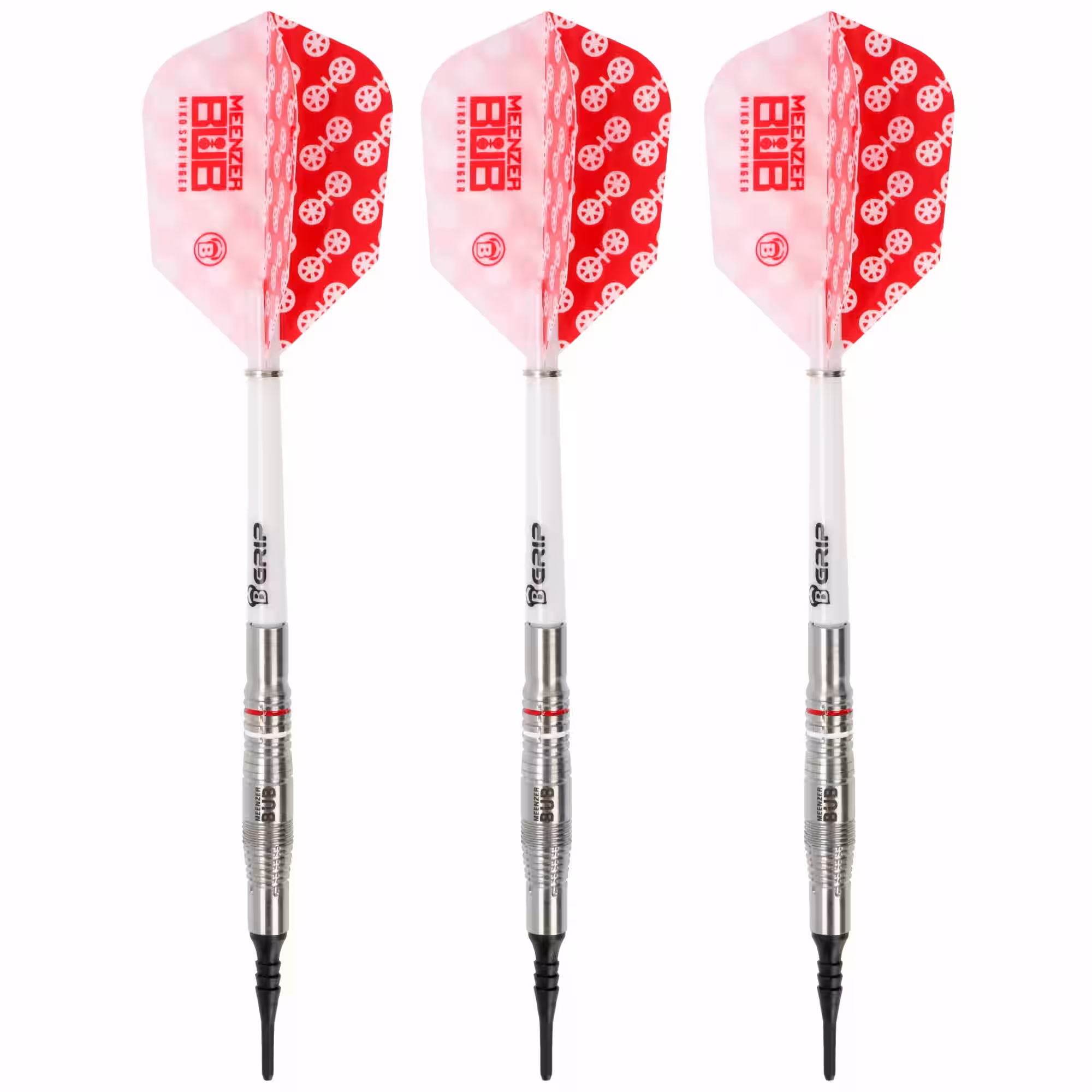 Niko Springer Softdarts, silber, 22 Gramm Die BULL’S Niko Springer Softdarts wurden in enger Zusammenarbeit mit dem deutschen Dartspieler Niko Springer entwickelt und vereinen höchste Präzision mit individuellem Design. Gefertigt aus hochwertigem 90% Tungsten, sind die Darts in 22g erhältlich. Das Barrel zeichnet sich durch die charakteristische Niko Springer-Form aus und überzeugt mit einer Vielzahl radialer Gripzonen, die über das gesamte Barrel verteilt sind. Besonders hervorzuheben ist die axiale Gripzone im vorderen Bereich, die maximale Kontrolle über die Fingerposition ermöglicht – ideal für präzises Spiel. In der Mitte des Barrels befindet sich eine edle Lasergravur mit dem BULL’S-Logo sowie dem Schriftzug “Meenzer Bub”. Zwei farbige Ringe, ein roter und ein weißer, im hinteren Bereich sorgen nicht nur für einen optischen Akzent, sondern unterstützen auch das Wiedererkennen des individuellen Designs. Der Übergang zum weißen B-Grip2 Medium Schaft ist bewusst clean und grifflos gehalten, um einen flüssigen Übergang zum Schaft zu gewährleisten. Ein besonderes Highlight ist der speziell für Niko Springer entwickelte X-Powerflite XXL. Dieser Flight bietet durch seine vergrößerte Fläche außergewöhnlich stabile Flugeigenschaften und ist exakt auf Nikos Spielweise abgestimmt. Die BULL’S Niko Springer Softdarts sind damit die perfekte Wahl für ambitionierte Spieler, die Wert auf professionelle Qualität und ein einzigartiges Setup legen. Technische Daten für den Steeldart Ausführung: komplett 3 Softdartpfeile Art: Tungsten 90% Silberfarben Farbe: Silber, rot, weiß System: Soft Dart Komplettpfeile Gewicht: ca. 22 Gramm komplett Abmessungen: 44,3 x 7,2mm, Länge Gesamt 145mm