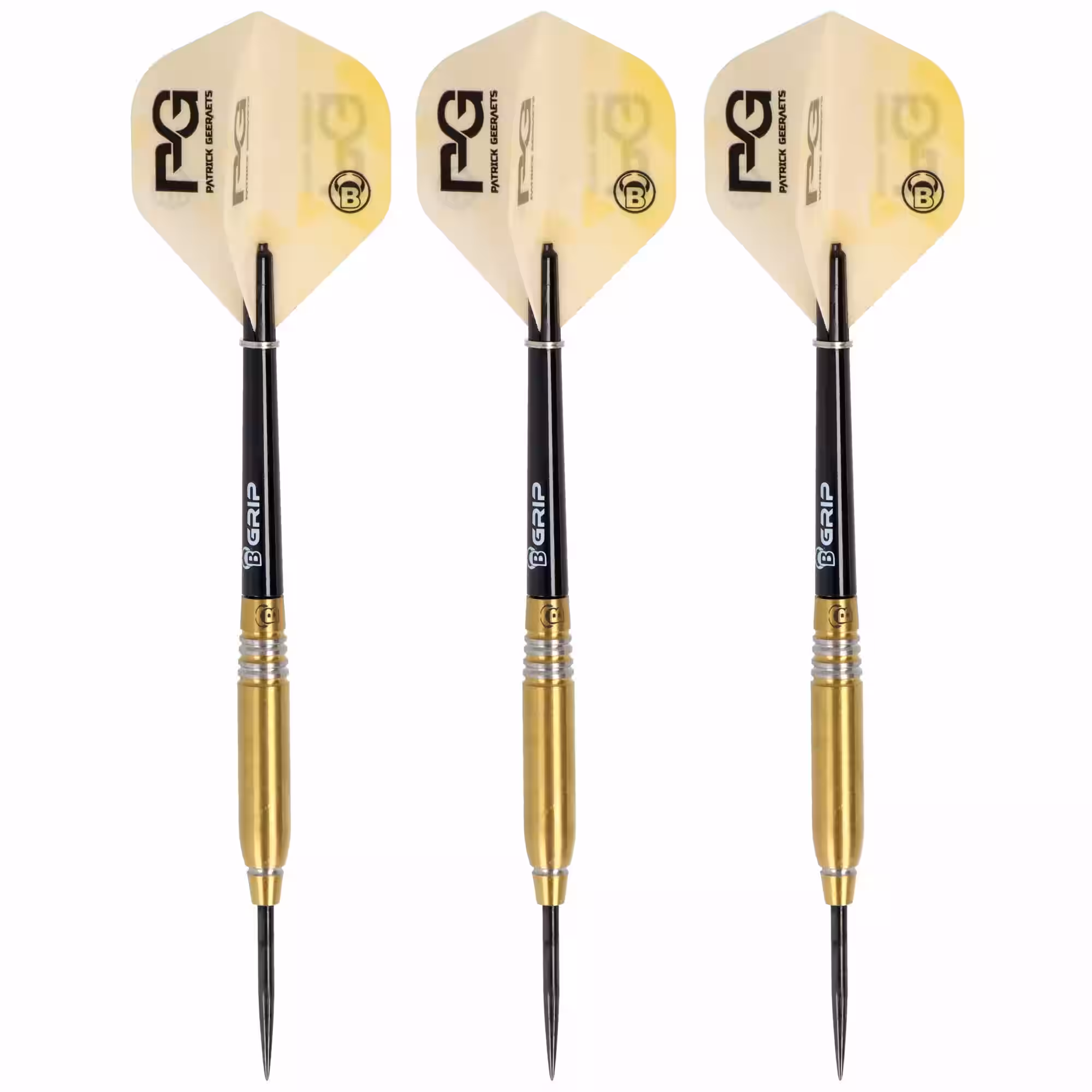 Bulls Patrick Geeraets Steeldart, gold, 23 Gramm kurz und kompakt, die Patrick Geeraets Steeldarts stellen sich vor ✅ Patrick Geeraets Steeldarts von Bull’s! ✅ Gewicht 23 Gramm ✅ 90% Tungsten ✅ Barrel mit Gold Finish und schlankem Profil ✅ Barrel Länge 42,7mm, Durchmesser 7,3mm ✅ hochwertige Verarbeitung, gewohnt hohe Qualität von Bulls! Stell dir vor, du greifst zu einem Dart, der nicht nur durch sein Erscheinungsbild besticht – goldene Eleganz trifft auf präzises Design – sondern auch durch seine Performance überzeugt: Der Bulls Patrick Geeraets Steeldart (23 g) ist genau so ein Pfeil. Er ist maßgeschneidert, um deinem Spiel Stabilität, Stil und Kontrolle auf Profi-Niveau zu verleihen. Design und Materialqualität Gefertigt aus 90 % Tungsten, bringt der Dart eine ideale Balance aus Gewicht und Handhabung mit – schlank, aber stabil. Die edle goldene Beschichtung verleiht nicht nur optische Finesse, sie schützt auch vor Korrosion und sorgt langfristig für ein gepflegtes Finish. Jeder Blick auf das Barrel lässt dich wissen: Hier steckt echte Premium-Qualität drin. Barrel-Abmessungen: perfekt proportioniert Mit einer Länge von 42,7 mm und einem Maximaldurchmesser von 7,3 mm liegt der Dart kompakt und angenehm in der Hand. Die Maße sind ideal für ambitionierte Spieler, die präzise Würfe schätzen – weder zu kurz noch zu voluminös – einfach ergonomisch perfekt. Perfekter Grip, reproduzierbare Haltung Die Griffflächen sind bewusst reduziert und gezielt positioniert: Hintere Zone: Doppelring-Grip mit silberner Akzentuierung – bietet dir sicheren Halt und ein vertrautes Griffgefühl. Vordere Zone: Eine präzise Fräsung dient als klarer Griffreferenzpunkt – deine Hand findet jedes Mal dieselbe Position. Diese Kombination bringt maximale Kontrolle für konstant präzise Würfe – unabhängig vom Druck oder Turniermoments. Bulls Patrick Geeraets Steeldart – 90% Tungsten und 23 Gramm Gewicht Der Dart kommt serienmäßig mit einem schwarzen B‑Grip2 SL‑Schaft und dem Patrick Geeraets Metrixx‑Flight (150 Micron) – robust, langlebig und optisch stimmig abgestimmt. Zusammen ergeben Barrel, Schaft und Flight ein homogenes Set, das sofort einsatzbereit ist und professionelles Feeling vermittelt. Spieler-geprüftes Design Entwickelt in enger Zusammenarbeit mit Patrick Geeraets persönlich – du erhältst hier also nicht einfach ein Standardmodell, sondern einen Signature-Dart, der gezielt nach den Anforderungen und Präferenzen eines Profis gestaltet wurde. Jeder Schnitt, jede Fräsung, jede Beschichtung trägt seine Handschrift – und das spürst du bei jedem Wurf. Verpackung und Gesamteindruck Auch für Lagerung und Versand ist gesorgt: Laut Produktseiten kommt der Dart sicher verpackt – Bulls produziert ihn mit halbprofessioneller Verpackung, die dein wertvolles Set schützt und gleichzeitig stilvoll präsentiert. So kommst du stets gut an dein Equipment, ohne dass irgendetwas beschädigt wird oder nachgeliefert werden muss. Fazit – Dein Dart für ambitionierte Ziele Mit dem Bulls Patrick Geeraets Steeldart (23 g, Gold) holst du dir ein Tool an die Hand, das Design, Funktionalität und Profi-Erfahrung vereint. Jeder Aspekt – vom Material über die Gripzonen bis zur Verpackung – ist durchdacht und präzise auf dich und deinen Spielstil zugeschnitten. Du bekommst ein edles, ausgewogenes und haltbares Setup, das bereit ist, dich bei deinem Weg auf die Darts-Bühne zu begleiten. Du willst stilvoll, kontrolliert und souverän werfen? Dann ist dieser Signature-Dart genau dein Partner – schnapp ihn dir und fühl dich wie ein Pro am Oche! Technische Daten Material: 90% Tungsten Gewicht: 23 Gramm Länge: 42,7mm Durchmesser: 7,3mm Farbe: Silber, Gold