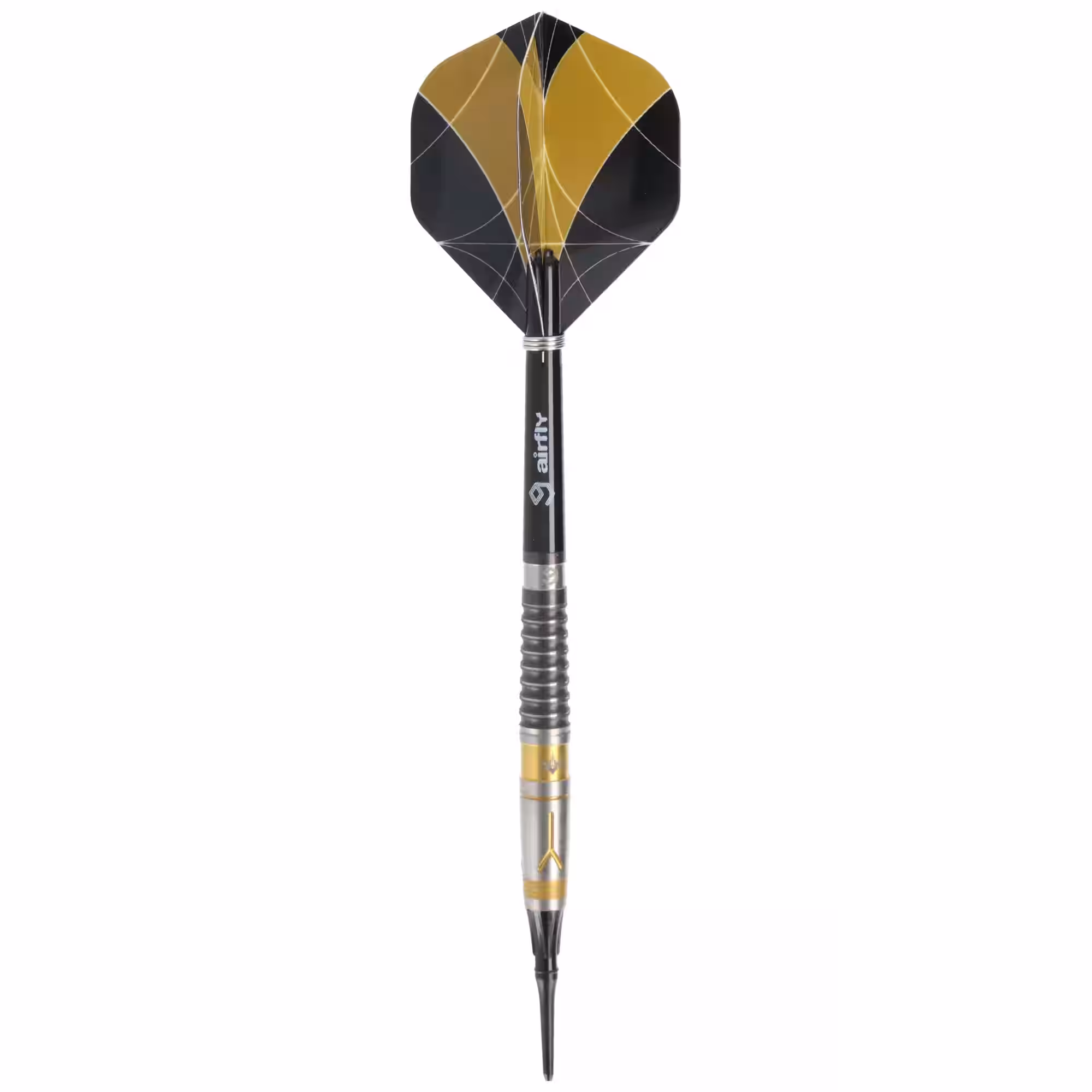 Caliburn Y Softdart, schwarz gold, 90% Tungsten, 20 Gramm kurz und kompakt, die Caliburn Y Softdarts stellen sich vor ✅ Y Softdarts von Caliburn! ✅ Gewicht 20 Gramm ✅ 90% Tungsten ✅ leicht torpedoförmiges Barrel mit Ringgrip und einem glatten, gefrästen Bereich an der Rückseite! ✅ hochwertige Verarbeitung, gute Verpackung! Du bist auf der Suche nach einem hochwertigen Softdart, der nicht nur durch Leistung, sondern auch durch sein edles Design überzeugt? Dann ist der Caliburn Y Softdart in Schwarz-Gold genau das Richtige für Dich. Dieser Dart vereint edle Materialien, präzise Verarbeitung und ein außergewöhnliches Design zu einem Gesamtpaket, das sowohl Anfänger als auch fortgeschrittene Spieler begeistert. Hochwertiges Material für präzise Würfe Der Caliburn Y Softdart besteht aus 90 % Tungsten (Wolfram) – einem Material, das wegen seiner Dichte und Widerstandsfähigkeit bei Darts sehr geschätzt wird. Durch den hohen Wolframanteil ist der Barrel besonders schlank und ermöglicht enge Gruppierungen am Board. Du wirst schnell merken: Dieser Dart liegt nicht nur gut in der Hand, sondern lässt sich auch wunderbar kontrollieren. Gerade für präzise Würfe und eine saubere Flugbahn ist das ein riesiger Vorteil. Caliburn Y Softdart – Deine neue Geheimwaffe im Softdart-Spiel Das leicht torpedoförmige Design des Barrels sorgt für eine ausgewogene Balance. Der Schwerpunkt liegt etwas weiter vorne, was vielen Spielern ein besonders angenehmes Wurfgefühl vermittelt. Du wirst spüren, wie der Dart fast wie von selbst seinen Weg zum Board findet – ideal für einen gleichmäßigen, wiederholbaren Wurfstil. Diese Form eignet sich besonders gut, wenn Du mit mittlerem bis vorderem Griff spielst. Die aerodynamische Linie des Barrels minimiert Luftwiderstand und sorgt für einen stabilen Flug. Auch bei schnellen Wurffolgen bleibt der Dart ruhig und präzise in der Spur. Ringgrip vorne – glatte Kontrolle hinten Ein weiteres Highlight dieses Softdarts ist der durchdachte Gripbereich. Vorne findest Du einen griffigen Ringgrip, der für zuverlässigen Halt beim Wurf sorgt. Die Ringe bieten Dir ein direktes Feedback und machen es leicht, Deinen Griffpunkt intuitiv zu finden. Das ist besonders wichtig, wenn Du Deinen Wurf weiterentwickeln oder perfektionieren möchtest. Im hinteren Bereich wartet der Dart mit einem glatt gefrästen Segment auf – ohne zusätzliche Grip-Struktur. Dieser Übergang wirkt nicht nur elegant, sondern erlaubt Dir auch eine flexible Handhabung. Wenn Du Deinen Griff weiter hinten ansetzt oder den Dart leicht korrigieren willst, stören keine übermäßigen Grip-Elemente. Der Wechsel von strukturierter zu glatter Oberfläche verleiht dem Dart zusätzlich eine edle, durchdachte Ästhetik. Schwarz-goldene Optik – ein Statement am Oche Was sofort ins Auge sticht, ist die edle Schwarz-Gold-Beschichtung. Dieser Farbmix verleiht dem Caliburn Y eine besonders hochwertige Ausstrahlung – dezent, aber markant. Ob im heimischen Spielzimmer, beim Training mit Freunden oder beim Turnier: Mit diesem Dart zeigst Du Stilbewusstsein und Anspruch. Die Beschichtung ist nicht nur optisch ein Highlight, sondern schützt auch die Oberfläche des Barrels vor Abnutzung und verleiht ihm eine angenehme Haptik. Ideal ausbalanciert – 20 Gramm Gesamtgewicht Mit einem Gewicht von 20 Gramm gehört der Caliburn Y zu den beliebtesten Softdart-Gewichtsklassen. Er bietet Dir genügend Masse für ein kontrolliertes Wurfverhalten, ohne zu schwer oder unhandlich zu wirken. Ob Du ein erfahrener Spieler bist oder gerade erst Deinen Stil entwickelst: Dieses Gewicht passt sich flexibel Deinen Bedürfnissen an. Lieferung inklusive Caliburn Shafts und Flights Du erhältst den Caliburn Y Softdart natürlich als komplettes Set: Im Lieferumfang enthalten sind hochwertige Caliburn Shafts sowie stylishe Flights, die perfekt zum Design des Barrels passen. Das bedeutet: Du kannst direkt loslegen – alles, was Du brauchst, ist bereits dabei. Die Komponenten sind aufeinander abgestimmt, sodass Flugverhalten und Balance ideal harmonieren. Hochwertige Verarbeitung & edle Verpackung Nicht nur der Dart selbst überzeugt – auch die Verarbeitung und die Verpackung setzen Maßstäbe. Jeder einzelne Barrel ist präzise gefräst, mit sauber gearbeiteten Übergängen und feinen Details. Kein Grat, keine Unregelmäßigkeiten – einfach makellose Qualität. Und die Verpackung? Die macht richtig was her! Stabil, sicher und optisch ansprechend – ideal zum Verschenken oder zum stilvollen Transport Deiner Darts. Du willst Deine Dartsammlung aufwerten oder ein starkes Statement am Board setzen? Dann ist der Caliburn Y Dein perfekter Begleiter. Fazit Der Caliburn Y Softdart in Schwarz-Gold ist nicht einfach nur ein Dart – er ist ein Werkzeug für präzises Spiel, ein Statement für Stil und ein Ausdruck Deines Anspruchs. Mit seinem 90% Tungsten-Barrel, der intelligenten Grip-Kombination und der hochwertigen Verarbeitung bringt er alles mit, was Du für ein erfolgreiches Spiel brauchst. Dazu sieht er einfach verdammt gut aus. Gönn Dir das Beste – Caliburn Y. Präzise. Stilvoll. Leistungsstark. Technische Daten Art: Softtip Material: 90% Tungsten Gewicht: 20 Gramm Farbe: Schwarz, silber, gold