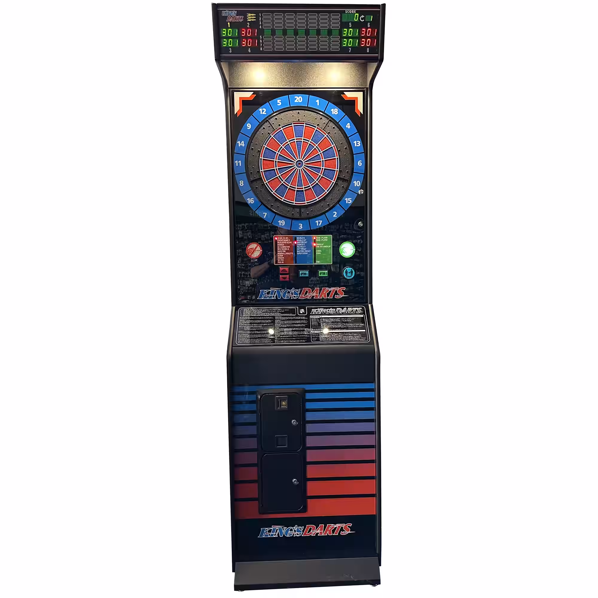 Dart BEST Dartautomat Standgerät für 1-8 Spieler, mit Münzeinwurf kurz und kompakt, unser DartBEST II (früher KingsDart) Dartautomat stellt sich vor ✅ DartBest Softdart Dartautomat Standgerät ✅ der Dartautomat mit Münzeinwurf und 5 Knöpfen ✅ idealer Dartautomat auch für den Liga Betrieb, Wirtschaft etc. ✅ ideal für Wirtschaften, Pubs, Vereinsheime etc. Premium DartBEST Dartautomat für 1 bis zu 8 Dartspieler, jetzt NEU mit LEO Funktion Dartautomat als Standgerät – der neue DartBEST II Dartautomat mit den Turnierabmessungen für Hobby und Liga, er ist sowohl bei Freizeitspielern im Hobbyraum als auch im Ligabetrieb und der Wirtschaft durch unzählige, innovativ wählbare Dartspiele und technische Highlights begehrt. Mit seinen Dartspielen wie z.B. 301, 501, 701, 901, Cricket, Mark21, Hi-Score, Lo-Score, Super Score, Shanghai, 301 Elimination, Split Score 40,Rapid Fire, Baseball, Roulette bietet er viel Dartspielvarianten an. Er glänzt durch seine Dartautomaten Features: Multifunktionales Display mit bis zu 8 Cricket Dartspielen Nützlich Spielvorschläge während des Dartspiels Statistik für jeden Spieler und jedes Team am Spielende Einfache Menüführung und leicht zu navigierenden Standard- und Quadro-Ziel Funktion Beleuchtete Zahlen rund um das Spielfeld bzw. Ziel Spiele 301 bis 901 + 180 + 501 fünf Spieloptionen Double-in, Double-out, Masters-out Teammodus und viel mehr Cricket-Spiele: Cricket, Mark21, Chance it, Pick it Alle Spiele können auch im Teammodus gespielt werden Neuheitsspiele 301 Eliminierung, Schnellfeuer, Split Score 40 Drache, Handicap-Modus, Timeout-Handicap-Modus Compa – Spiel gegen Computer mit verstellbaren Stufen Zeitspiel – rechnen Sie Ihre Credits in Zeiteinheiten um mit Happy Hour, Uhr Der DartBEST 2 Turnier Dartautomat ist sowohl bei Hobby als auch Ligaspieler durch unzählige innovative Dartspiele und technische Highlights beliebt. Die bedienerfreundliche Oberfläche in Verbindung mit der wartungsarmen Technik erfüllt alle Anforderungen des Softdart Dartspielens im privaten als auch gewerblichen Bereichen. Die Funktionen im Überblick: Softdart Zielscheibe 13,5 Zoll mit Turnierabmessungen DartBEST mit automatischem Spielerwechsel mit automatischer Fehlwurferkennung mit Spielmöglichkeit für bis zu 8 Spieler, 8 Crickets mit tollen Lichteffekten und beleuchtetem Nummernwurfkreis mit einfachen Einstellungen der Spielvarianten mit einfachen Einstellungen der Preise pro Dartspiel mit einfacher Rückstellung auf die Standardwerte Geldeinwurf, mit elektronischem NRI-Münzprüfer Farbe Ausführung: schwarz Technische Daten DartBEST (früher King´s Dart) Abmessungen ca. 220 x 62 x 50 cm Gewicht: ca. 89 Kilogramm Alle Zubehör- und Ersatzteile für den DartBEST, King´s Darts, KingsDart und alle baugleichen Modelle bekommen Sie natürlich auch bei uns im kilo80 Dartshop Die Lieferung erfolgt bei uns per Abholung oder gegen Zuzahlung von EUR 100,- mit einer Spedition per Palette. Die Lieferzeit beträgt ca. 7-14 Werktage. Abbildung ähnlich!