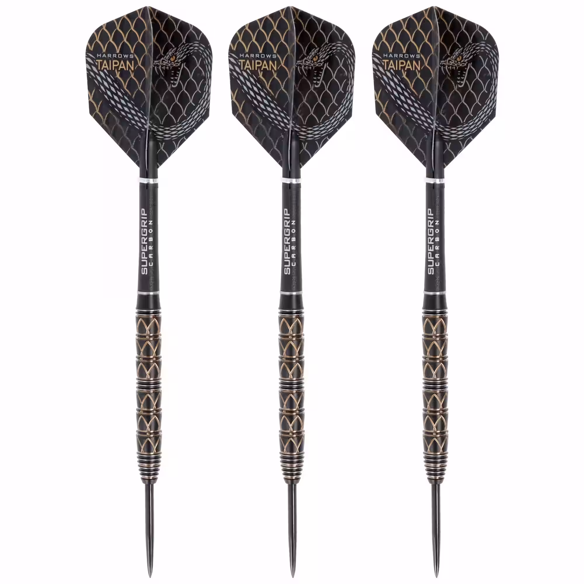 Harrows Taipan Steeldart, 90% Tungsten, schwarz gold kurz und kompakt, die Taipan Darts stellen sich vor ✅ Taipan Steeldarts von Harrows! ✅ bitte gewünschtes Gewicht bei den Varianten auswählen! ✅ erhältlich in den folgenden Gewichten: 21, 22, 23, 24, 25, 26 Gramm ✅ 90% Tungsten ✅ außergewöhnliches Barrel mit angenehmen Grip! ✅ Titanium-Nitrid-Beschichtung, präzisonsgefertigt! ✅ hochwertige Verarbeitung, gewohnt hohe Qualität von Harrows! Bist Du auf der Suche nach einem außergewöhnlichen Steeldart, der nicht nur durch sein edles Design, sondern auch durch technische Finesse überzeugt? Dann ist der Harrows Taipan Steeldart genau das Richtige für Dich. Dieser Dart wurde für Spieler entwickelt, die kompromisslose Qualität, perfektes Handling und ein markantes Design in einem Produkt vereint sehen wollen. Und wenn Du Wert auf höchste Präzision und Langlebigkeit legst, wirst Du mit dem Taipan Deine Freude haben – Wurf für Wurf. 90% Tungsten – Für perfekte Balance und schlanken Aufbau Der Harrows Taipan Steeldart besteht aus 90 % Tungsten (Wolfram) – ein Material, das besonders bei ambitionierten Dartspielern beliebt ist. Warum? Weil es Dir erlaubt, schlanke Barrels mit hoher Dichte zu spielen. So kannst Du präzise Gruppierungen erzielen, ohne dass sich die Darts gegenseitig behindern. Die schlanke Bauweise ermöglicht Dir enges Stellen im Board und maximale Kontrolle beim Spiel – ob auf Turnierniveau oder in der heimischen Liga. Harrows Taipan Steeldart – Premium-Steeldart mit Stil, Präzision und Biss Du hast die Wahl: Der Harrows Taipan ist in sechs Gewichtsvarianten erhältlich – 21, 22, 23, 24, 25 und 26 Gramm. So findest Du garantiert das Gewicht, das perfekt zu Deinem Wurfstil passt. Ganz wichtig: Bitte wähle beim Kauf Dein gewünschtes Gewicht aus, damit Deine neuen Darts optimal zu Dir passen. Schwarz-Gold Titanium-Nitrid-Beschichtung für einen edlen Look Das erste, was Dir am Taipan Steeldart ins Auge fallen wird, ist das markante Design in Schwarz und Gold. Die edle Titanium-Nitrid-Beschichtung verleiht dem Dart nicht nur einen luxuriösen Look, sondern schützt das Barrel auch zuverlässig vor Abnutzung. Der goldene Glanz ist nicht nur optisch ein Highlight, sondern auch ein Zeichen für Langlebigkeit und Qualität. Beidseitig Inzision gefräst – für maximalen Grip Eines der absoluten Highlights des Taipan Barrels ist die beidseitige Inzision-Fräsung. Diese präzise eingearbeiteten Rillen bieten Dir einen außergewöhnlich angenehmen Grip, der sich sofort vertraut anfühlt. Egal, ob Du lieber vorne oder hinten greifst – das Barrel ist so konzipiert, dass Du überall perfekten Halt findest. So bekommst Du bei jedem Wurf ein sicheres Gefühl und behältst stets die volle Kontrolle über den Dart. Präzisionsgefertigt und hochwertig verarbeitet – Qualität, die Du spürst Wie von Harrows gewohnt, überzeugt der Taipan durch eine herausragende Verarbeitungsqualität. Jedes einzelne Barrel ist präzisionsgefertigt und unterliegt strengen Qualitätskontrollen. Das bedeutet für Dich: Du bekommst ein Produkt, das bis ins kleinste Detail durchdacht ist – für maximale Performance und ein unvergleichliches Spielgefühl. Inklusive Supergrip Carbon Schäfte – Stabil und langlebig Damit Du direkt durchstarten kannst, kommen die Taipan Steeldarts bereits mit hochwertigen Supergrip Carbon Schäften. Diese Schäfte sind besonders stabil, leicht und langlebig – genau das, was Du für ein dynamisches Spiel brauchst. Die Carbon-Verstärkung sorgt dafür, dass sie auch bei häufigem Spiel standhalten und Dir über lange Zeit treue Dienste leisten. 100 Micron Taipan Dart Flights – Stylisch und Stabil Auch bei den Flights wird nicht gespart: Mit dabei sind die speziell designten Taipan Dart Flights in 100 Micron Stärke. Diese bieten nicht nur ein auffälliges, passendes Design, sondern sind auch deutlich robuster als herkömmliche Flights. Sie behalten ihre Form länger, sorgen für einen stabilen Flug und ergänzen das Gesamtbild des Darts perfekt. Eindrucksvolle Verpackung – Taipan Design mit Stil Selbst die Verpackung des Harrows Taipan Steeldarts ist ein Statement. In der stilvollen Box im Taipan-Design macht sich der Dart auch als Geschenk hervorragend. Sie bietet nicht nur Schutz, sondern unterstreicht den Premium-Charakter dieses Produkts schon beim ersten Öffnen. Ein echtes Unboxing-Erlebnis – nicht nur für Dich, sondern auch für jeden Dartfan, dem Du damit eine Freude machen willst. Premium Darts für ambitionierte Spieler Ob Du bereits erfahrener Spieler bist oder gerade dabei, Dein Dartspiel auf ein neues Level zu heben – der Harrows Taipan ist eine Investition in Deine Performance. Hier bekommst Du einen Steeldart, der in Sachen Technik, Design und Handling keine Kompromisse eingeht. Harrows steht seit Jahrzehnten für höchste Qualität, und mit dem Taipan beweisen sie einmal mehr, warum sie zu den Top-Marken im Dartsport zählen. Dein nächster Wurf beginnt jetzt Wenn Du einen Dart suchst, der sich von der Masse abhebt, dabei aber zuverlässig und präzise performt, dann ist der Harrows Taipan Steeldart genau Dein Modell. Wähle jetzt Dein bevorzugtes Gewicht und erlebe Darts auf einem neuen Niveau. Mit dem Taipan in der Hand hast Du nicht nur ein technisches Meisterwerk, sondern auch ein Dart mit echter Persönlichkeit. Und das Beste: Du wirst ihn nicht mehr aus der Hand legen wollen. Technische Daten Art: Steeltip Farbe: Schwarz, Gold Material: 90% Tungsten