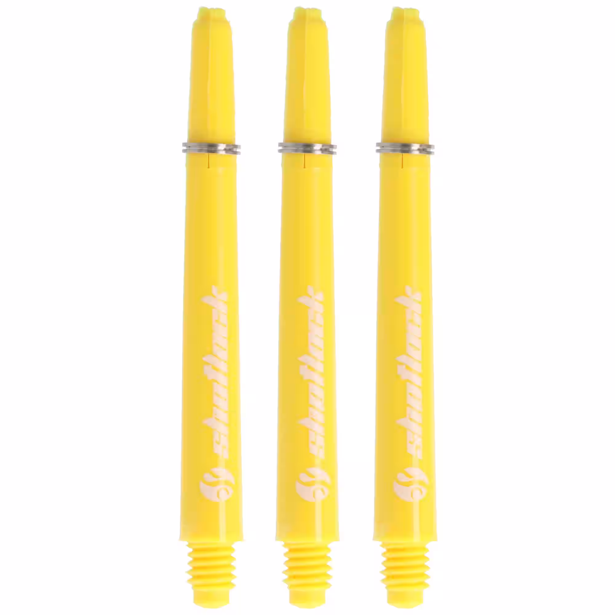 Dart Shaft gelb in Nylon Qualität, medium kurz und kompakt, unser Nylon Dartshaft Klassiker in der Neuaflage stellt sich vor ✅ gelber Dartschaft Nylon im 2BA Standardgewinde ✅ millionenfach bewährte, gleichbleibende Qualität in sehr guter Verarbeitung! ✅ Dartschaft 2Ba Durchmesser Schraubgewinde: ca. 0,4cm ✅ Softtip Gewinde 6 mm 2BA das Standardgewinde ✅ gewohnt hoher Nylon Standard ! ✅ Länge mit Gewinde: mm, Länge ohne Gewinde: mm ✅ Nylon in hochwertiger Verarbeitung ! Die neuen Shot Lock Nylon Dartschäfte – Robust und sicher im Griff Optimieren auch Du Dein Dart-Setup mit den Shot Lock Nylon Dartschäften. Sie sind für Langlebigkeit und Präzision entwickelt worden. Die Dartschäfte aus dem hochwertigem Nylon bieten Dir Stabilität und Flexibilität und halten auch intensivem Spiel stand. Egal ob Freizeitspieler oder Profi-Dartspieler, diese Schäfte bieten die nötige Zuverlässigkeit für konstante Leistungen. Die Eigenschaften der Nylon Shafts Stark und langlebig: Die Schäfte aus hochwertigem Nylon sind leicht und dennoch robust und bieten Euch eine dauerhafte Leistung. Shot Lock Ringe inklusive: Die Shot Lock Ringe fixieren den Flight sicher und verhindern ein Ablösen während des Spiels. Universell kompatibel: Dank Standard-2BA-Gewinde für die meisten Darts geeignet. Preisgünstige Qualität: Eine preisgünstige Option ohne Kompromisse bei der Leistung – perfekt für Anfänger und Fortgeschrittene. Perfekt für alle Spielstile Mit ihrer robusten Konstruktion und dem sicheren Sitz sind die Shot Lock Nylon Dartschäfte eine ausgezeichnete Wahl für Dartspieler aller Spielstärken. Die mitgelieferten Shot Lock-Ringe sorgen für einen festen Sitz zwischen Flight und Schaft und verhindern so ein Ablösen des Flights beim Werfen. Optimiere auch Du Deine Dartspiele Bringen Dein Dartspiel auf das nächste Level mit den zuverlässigen und günstigen Schäften von Shot. Erhältlich in verschiedenen Farben und Größen, bieten sie individuelle Anpassungsmöglichkeiten für Deinen Dartstil. Hol Dir noch heute Deine neuen Schäfte und erleben den Unterschied! Shot Shot Lock Shafts Die verfügbare Größen: Kurz, Mittel und Lang Verfügbare Farben: Pink, Gelb, Grün, Blau, Rot, Schwarz, Weiß Technische Daten für die Nylon Dart Shaft Material: Nylon Stärke: Standard bis robust Farbe: gelb / yellow System: 2BA Gewinde Gewicht: ca. 1,1 Gramm Abmessungen: 47mm, ca. Länge mm mit Gewinde Nylon Schäfte sind immer gut zu den Stoff-Flights passend und werden gerne zusammen mit den meist silbernen Kronen eingesetzt. Der Schaft der Profis. Alte Darthasen schätzen die Qualität und Belastbarkeit, dieser Dartschäfte aus Nylon, sie sehen vielleicht nicht so trendig aus wie moderne andere Schäfte, aber sie sind bewährt, extrem langlebig und formstabil. Deshalb gehören sie zu den Favoriten der Schäfte. Unwahrscheinlich robuster Schaft in extra 40mm. Inhalt der Lieferung: 3 Schäfte, cm Gewicht ca. Gramm (Abbildung ähnlich, kann je nach Fertigungscharge farblich heller oder dunkler abweichen, teilweise abgebildete Teile und Darts, Flights, Spitzen, Dartboards nicht enthalten)