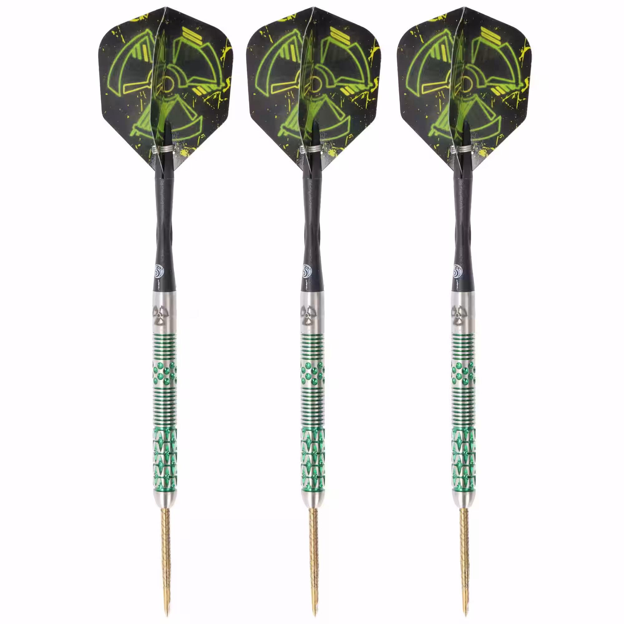 Shot Pro Series Stowe Buntz 2.0 Steeldart, 90% Tungsten, 23 Gramm kurz und kompakt, die Shot Stowe Buntz Steeldarts stellen sich vor ✅ Stowe Buntz 2.0 Steeldarts von Shot! ✅ Shot Pro Series ✅ Gewicht 23 Gramm ✅ 90% Tungsten ✅ Barrel Länge 55mm, Durchmesser 6mm ✅ hochwertige Verarbeitung, gewohnt hohe Qualität von Shot! Die Shot Pro Series Stowe Buntz 2.0 Steeldarts sind nicht einfach nur Darts – sie sind ein Statement. Entwickelt für Spieler, die keine Kompromisse bei Präzision, Qualität und Design eingehen wollen, verkörpern diese 23-Gramm-Darts alles, was die Marke Shot! auszeichnet: kompromisslose Qualität, durchdachtes Design und ein unverkennbarer Charakter. Mit einem beeindruckenden Tungsten-Anteil von 90 %, einer optimalen Barrel-Länge von 55 mm und einem schlanken Durchmesser von 6 mm bieten sie ein ausgewogenes Spielgefühl und höchste Kontrolle – ideal sowohl für ambitionierte Hobbyspieler als auch für Profis. Hommage an den „Neon Nightmare“ – Stowe Buntz Namensgeber und Inspiration für diesen Dart ist der US-amerikanische Dartspieler Stowe Buntz, besser bekannt unter seinem Spitznamen „Neon Nightmare“. Sein auffälliger Stil, seine konzentrierte Spielweise und seine charismatische Erscheinung spiegeln sich in jedem Detail dieser Darts wider. Shot! hat mit diesem Modell nicht nur einen hochwertigen Dart entworfen, sondern auch ein Tribut an einen aufstrebenden Spieler geschaffen, der mit Mut und Präzision überzeugt. Design trifft Funktion – Die Eigenschaften im Detail Die Darts zeichnen sich durch eine gerade Barrelform aus, die sowohl klassischen Spielern als auch Technikliebhabern zugutekommt. Gerade Barrels bieten maximale Flexibilität im Griff und ermöglichen eine Vielzahl an Wurftechniken. Besonders erwähnenswert sind die mehreren Gripzonen und Griparten, die sich über den gesamten Barrel erstrecken. Unterschiedliche Fräsungen, Riffelungen und strukturierte Oberflächen sorgen dafür, dass jeder Spieler seinen idealen Halt findet – egal, ob vorne, mittig oder hinten gegriffen wird. Die silberne Grundfarbe wird durch markante grüne Akzente hervorgehoben, die dem Dart ein sportliches und auffälliges Erscheinungsbild verleihen. Hinzu kommt die vergoldete Steeldart-Spitze, die nicht nur optisch überzeugt, sondern auch für einen stabilen und sicheren Halt im Board sorgt. Die Kombination aus Farben und Materialien ergibt einen Dart, der sowohl im Board als auch in der Hand für Aufsehen sorgt. Shot Stowe Buntz 2.0 Pro Series Steeldart – Präzision trifft Persönlichkeit Die Barrels bestehen aus 90 % hochwertigem Tungsten, einem Material, das sich durch seine Dichte, Langlebigkeit und exzellente Verarbeitung auszeichnet. Diese Zusammensetzung ermöglicht ein schlankes Design bei gleichzeitig optimalem Gewicht – ein klarer Vorteil bei engen Gruppierungen im Board. Tungsten ist der bevorzugte Werkstoff professioneller Dartspieler und macht die Shot Pro Series Stowe Buntz 2.0 zu einem echten Premiumprodukt. Die Verarbeitung lässt keine Wünsche offen: Präzise CNC-Fräsungen, sauber gearbeitete Oberflächen und ein perfekt ausbalancierter Schwerpunkt sprechen für die gewohnte Qualität von Shot!, einer Marke, die weltweit für ihre Innovationskraft und Handwerkskunst bekannt ist. Komplettset inklusive Flight & Shaft Die Darts kommen im kompletten Set, inklusive der exklusiven Shot Schäfte sowie den speziell designten Stowe Buntz Flights mit einer Stärke von 100 Micron. Diese Kombination sorgt für maximale Stabilität im Flug und ein rundum harmonisches Wurfgefühl. Die Flights sind nicht nur funktional, sondern spiegeln auch optisch das dynamische Design des Barrels wider – ein rundes Gesamtpaket, das sofort einsatzbereit ist. Warum die Shot Pro Series Stowe Buntz 2.0 Darts? Top-Material: 90 % Tungsten für eine perfekte Kombination aus Langlebigkeit und schlanker Form. Exakte Maße: Mit 23 Gramm Gewicht, 55 mm Barrel-Länge und 6 mm Durchmesser ideal ausbalanciert. Gripvielfalt: Unterschiedliche Fräsungen und Gripzonen für maximalen Halt – unabhängig vom Spielstil. Design-Highlight: Grüne Details, silberner Barrel, goldene Spitze – visuell ein echter Hingucker. Inspiriert von einem Profi: Der „Neon Nightmare“ Stowe Buntz steht für außergewöhnliches Dartspiel und stilvolle Performance. Direkt spielfertig: Inklusive hochwertiger Schäfte und langlebiger Flights (100 Micron). Fazit Die Shot Pro Series Stowe Buntz 2.0 Steeldarts vereinen alles, was moderne Darts ausmacht: durchdachtes Design, hochwertige Materialien, professionelle Verarbeitung und ein inspirierender Hintergrund. Wer auf der Suche nach einem Dart ist, der nicht nur technisch überzeugt, sondern auch optisch begeistert, wird hier fündig. Dieses Modell ist nicht nur ein Werkzeug für das Spiel – es ist ein Ausdruck von Persönlichkeit, Präzision und Performance. Ein Muss für alle, die das Beste aus ihrem Spiel herausholen wollen – mit Stil, mit Qualität, mit Shot! Technische Daten Material: 90% Tungsten Gewicht: 23 Gramm Farbe: Silber, grün Barrelform: Gerade Hersteller: Shot, Neuseeland 9415639067668