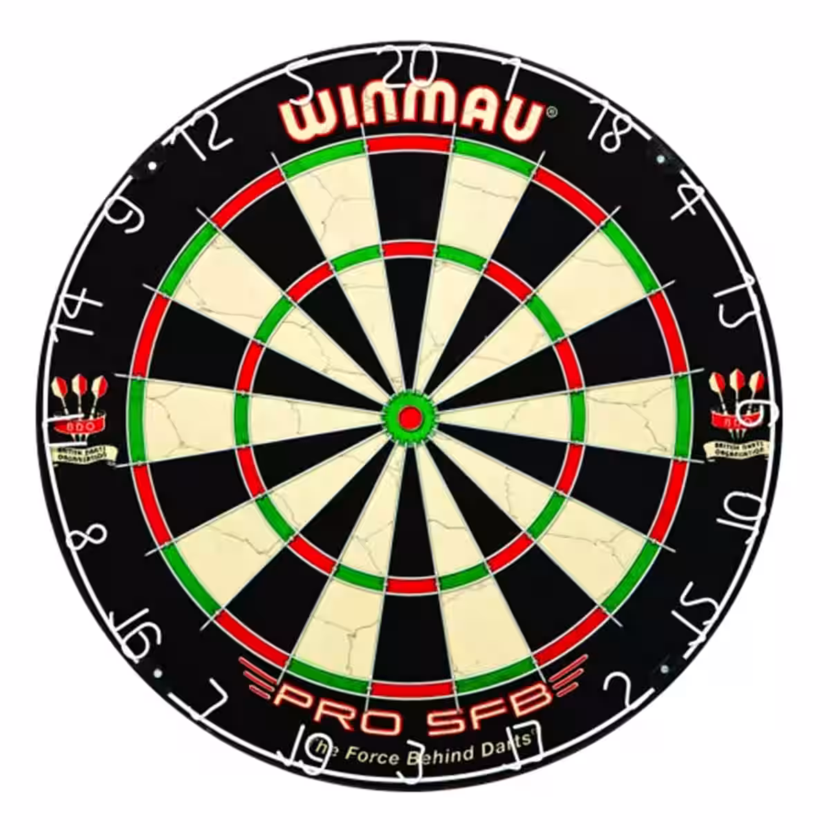 Winmau Pro SFB Dartboard Das Winmau Pro SFB Dartboard, vom weltweit f?hrende Hersteller f?r erstklassige Profi-Dartboards. WINMAU?Boards erf?llen alle Voraussetzungen der “British-Dart-Organisation” sowie der “World Dart Association” und werden speziell f?r Weltmeisterschaften eingesetzt. WINMAU verf?gt ?ber 60 Jahre Erfahrung in der Produktion von Dartboaards und ist daher un?bertroffen in?Perfektion und technischer Verarbeitung ? Winmau Pro SFB Dartboard Das Original?Winmau Pro SFB Dartboard?Turnierboard ist?sowohl f?r Steeldarts als auch f?r Softdarts gleicherma?en geeignet?und hat eine sehr lange Lebensdauer. Scheibendicke 40 mm, Turnierdurchmesser 45 cm, Gewicht ca. 5 kg. Auslieferung inklusive Aufh?ngung und Spielregeln ? Sichbtare Risse: Dartboards aus Sisal sind ein aus Naturprodukten hergestelltes Board (Sisal sind Fasern aus Bl?ttern einiger Agaven und werden unter hohem Druck in die bekannte, runde Form gepresst). Daher sind sichtbare Risse im Sisal sind keine Produktionsfehler oder Mangel (Naturprodukt). Zur Erkl?rung f?r alle Neueinsteiger: Die Sisalfasern werden i.d.R. zu Str?ngen gedrillt und anschlie?end in kleine Scheiben geschnitten. Diese Str?nge werden geb?ndelt verpresst. Die ?berg?nge der Sisalstr?nge k?nnen (von Board zu Board unterschiedlich) sichtbar sein, so dass sich die markanten Risse bilden k?nnen.