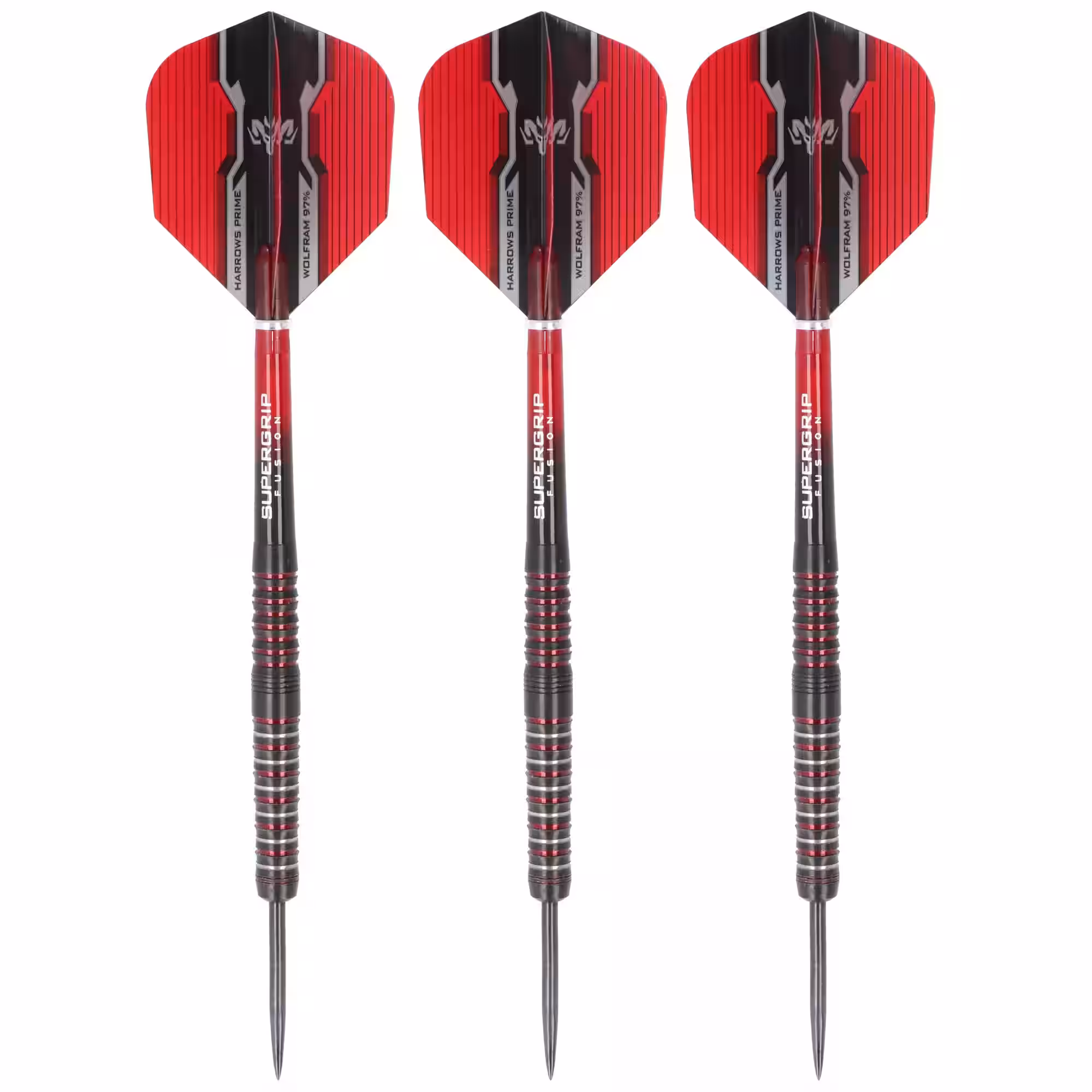 Harrows Wolfram 97%, schwarz, Tungsten, Steeldart, 23 Gramm kurz und kompakt, unser silberner Steeldart stellt sich vor ✅ Steeldart extra griffig, dank dem Rillengrip Profile! ✅ 97% Tungsten, gefertigt in England ! ✅ HD100, 100 Micron, Harrows Prime Flight! ✅ hochwertige Verarbeitung, gute Verpackung! Hergestellt aus hartem 97 % Tungsten bzw. deutsch Wolfram genannt. Steeldart Barrel schwarz. Eine einzigartige Kombination aus Doppelringen entlang der Länge des Barrels, was zu dem weltberühmten Supergrip-Griff führt. Veredelt mit einer haltbaren schwarzen Gravur. Die schwarzen Wolfram Steeldarts werden mit rot schwarzen Harrows Supergrip Schäften und neuen 100 Mikron Flights geliefert. Gewichtsgenauigkeit auf +/- 0,10 g gewogen. Wolfram 97% Steeldart, für Dartspieler, die einen guten bis starken Grip benötigen Der griffige Steeldart Barrel mit dem guten Grip für Dartspieler mit feuchten oder nassen Händen. Dank des guten Grips und den Rillen verrutscht fast wirklich kein Pfeil mehr in den Händen. Technische Daten für die kompletten Steeldarts Ausführung: Steeldart Art: 97 % Tungsten Farbe: silber, schwarz, rot System: Steeldart 2BA Standard Gewicht: ca. 23 Gramm Version Wolfram infinity